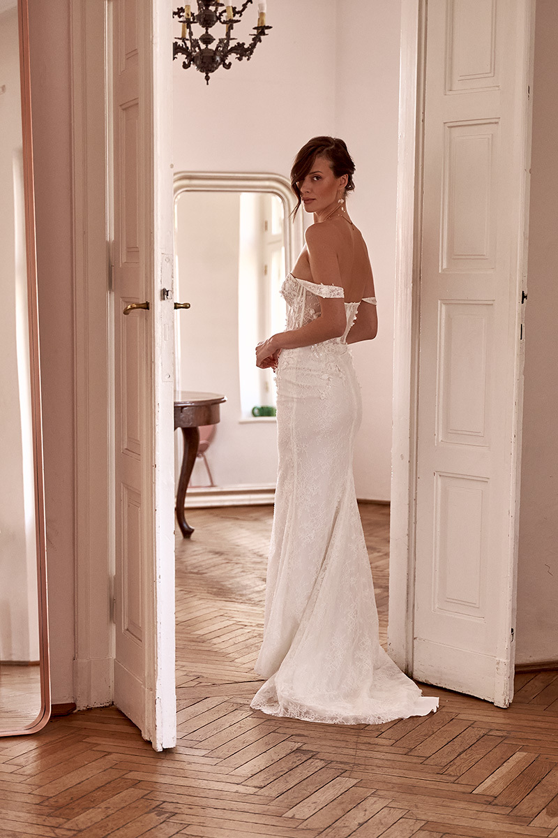 Prosta suknia ślubna z koronkową górą i gładkim wąskim dołem z rozporkiem.