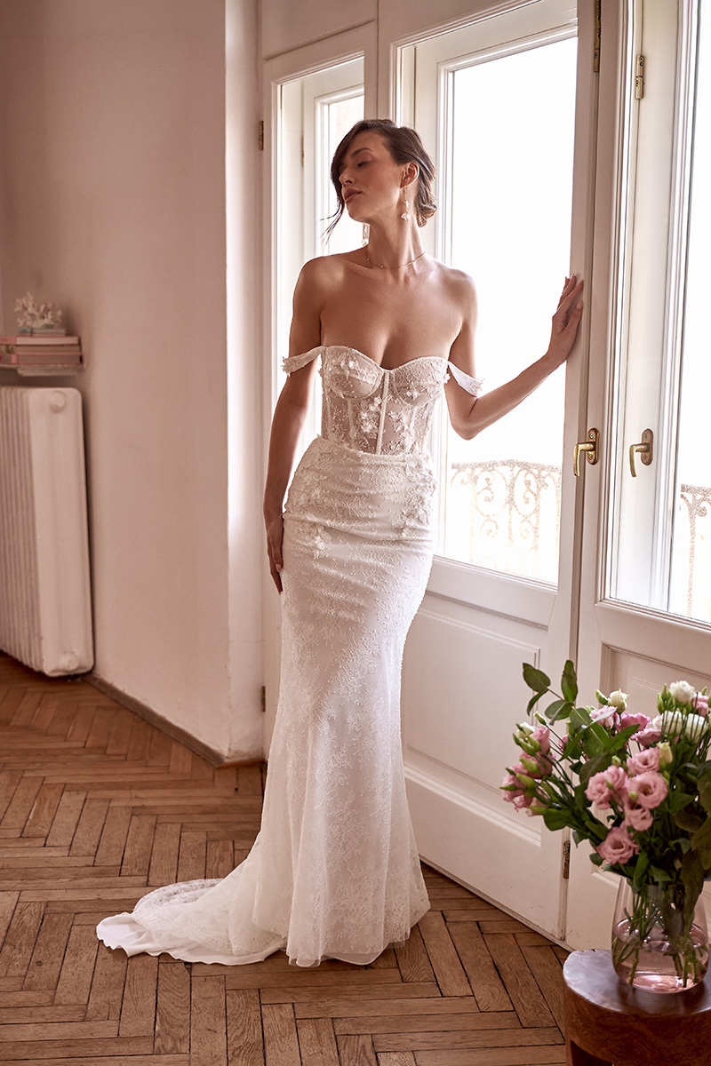 Lekka muślinowa suknia ślubna z głębokim dekoltem i muślinowymi rękawami.